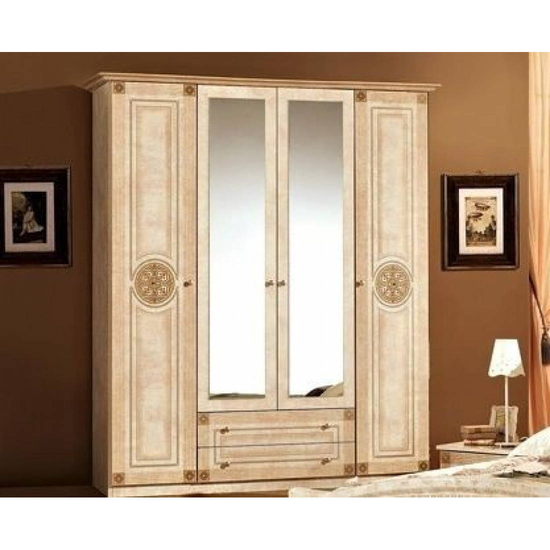 Четырехстворчатый шкаф Рома (беж) от Российской фабрики «ДИА мебель» выполнен в строгом, классическом стиле. Бежевый цвет в сочетании с глянцевым покрытием придает элегантность. Такой не большой но вместительный шкаф не обходим даже в маленькой спальне. Зеркало по центру шкафа придаст вашей комнате легкость. Вся коллекция "Рома" предназначена только для истинных ценителей элегантного классического стиля.