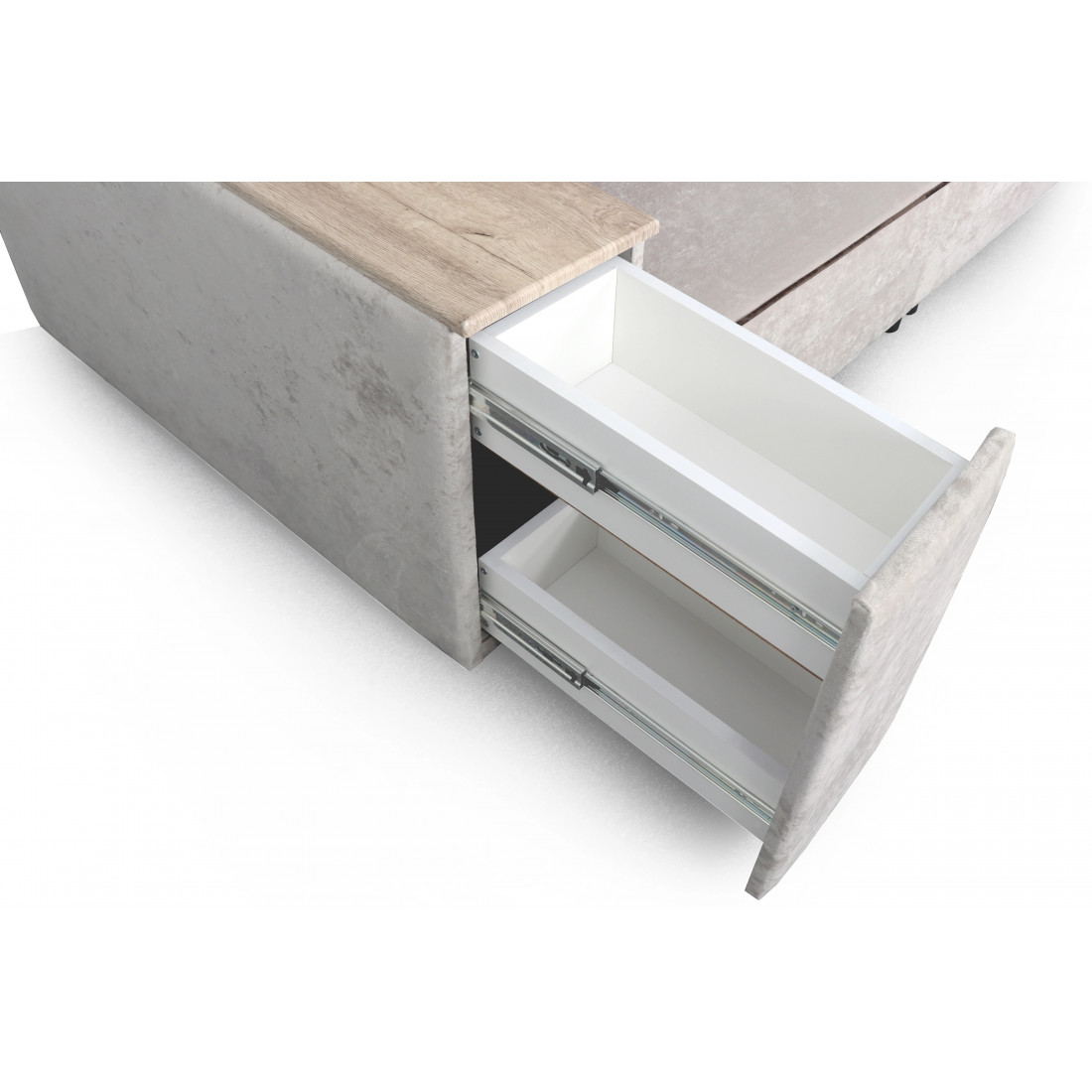 С одной стороны расположена боковина с нишей, с другой – ящики. Надежные петли с доводчиками добавляют комфортности использования мебели. Диван-трансформер может быть прямым, угловым и П-образным. Малые декоративные подушки входят в комплект дивана.