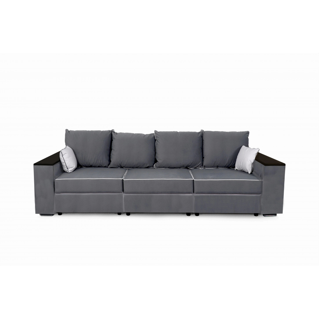 С одной стороны расположена боковина с нишей, с другой – ящики. Надежные петли с доводчиками добавляют комфортности использования мебели. Диван-трансформер может быть прямым, угловым и П-образным. Малые декоративные подушки входят в комплект дивана.