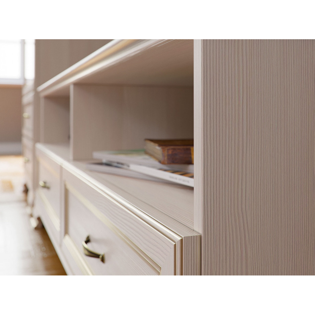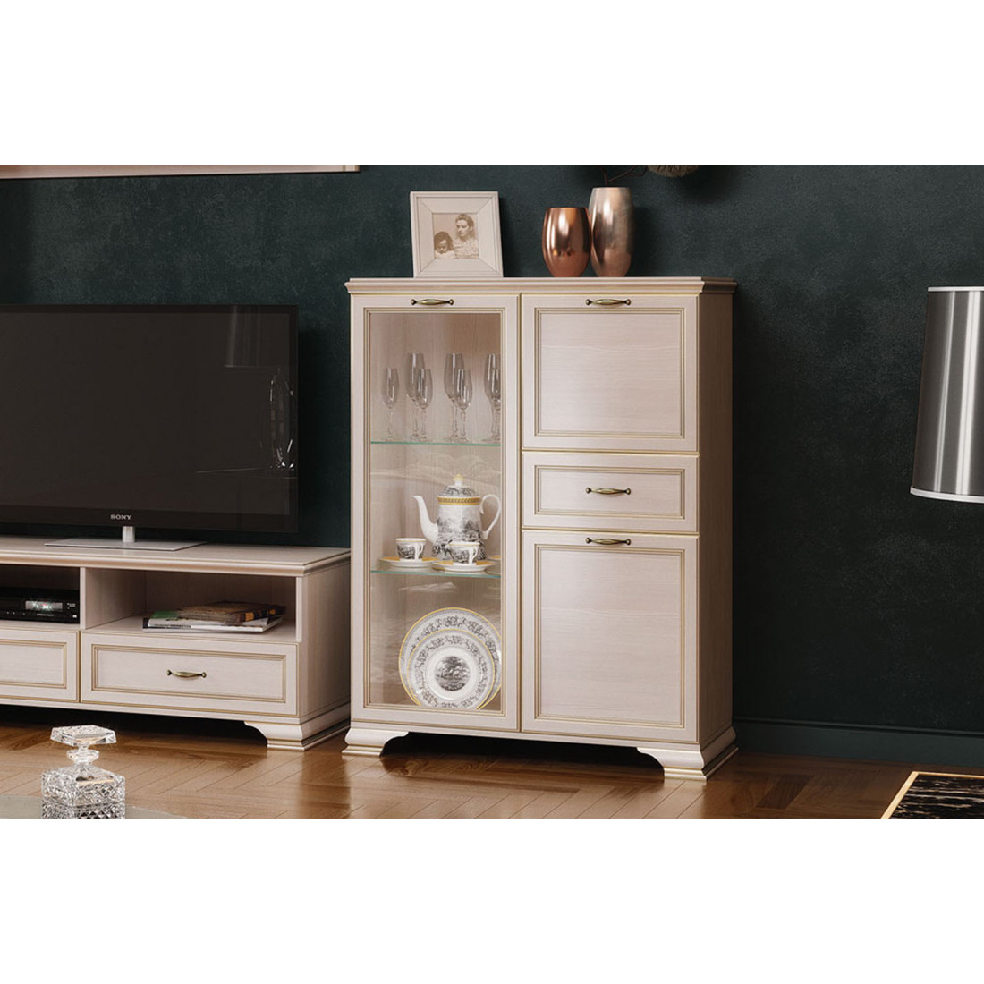 Подбирая мебель для гостиной, вы найдете все необходимые модули для размещения книг, посуды, памятных мелочей и телевизионной техники. Стандартная комплектация шкафа-витрина и шкафов низких предусматривает полки ЛДСП, однако отдельной опцией к ним предлагаются стеклополки.