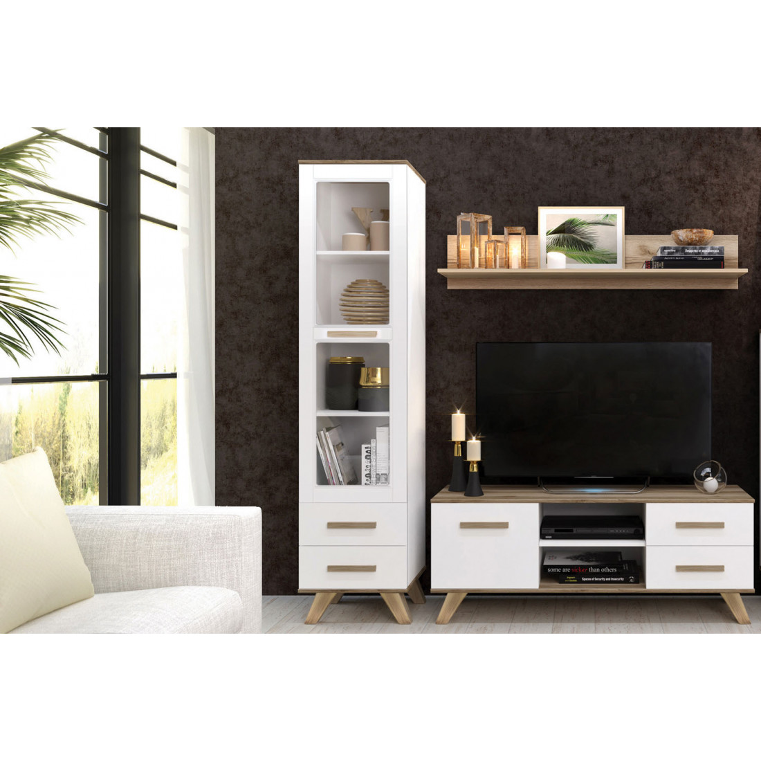 Витрины с прозрачным стеклом и многофункциональный комод в скандинавском стиле. Витрины позволят хранить посуду, книги и другие вещи. В нижней части шкафов-витрин предусмотрены выдвижные ящики. В центральной части композиции стоит большой комод - это  вместительный элемент гостиной с ящиками и дверцами, который служит для размещения различных элементов, а так же телевизора. набор мебели представлен в исполнении ЛДСП «Дуб каньон» + «белый», фасады - МДФ в пленке ПВХ «глянец белый».