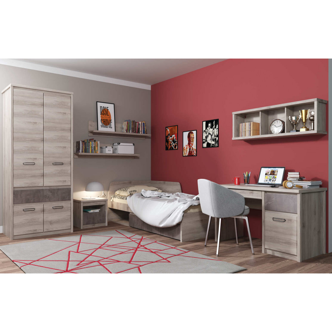 Детская Джаз выполнена в современном стиле. Отличительной особенностью этой коллекции является одновременное применение двух вариантов открывания двери: при помощи металлических ручек на одних фасадах и внутренней фрезеровки на других. Фасады выдвижных ящиков могут быть выполнены как в цвете оникс, так и в цвете каштан найроби. Эта мебель станет заслуженным украшением для любого интерьера.