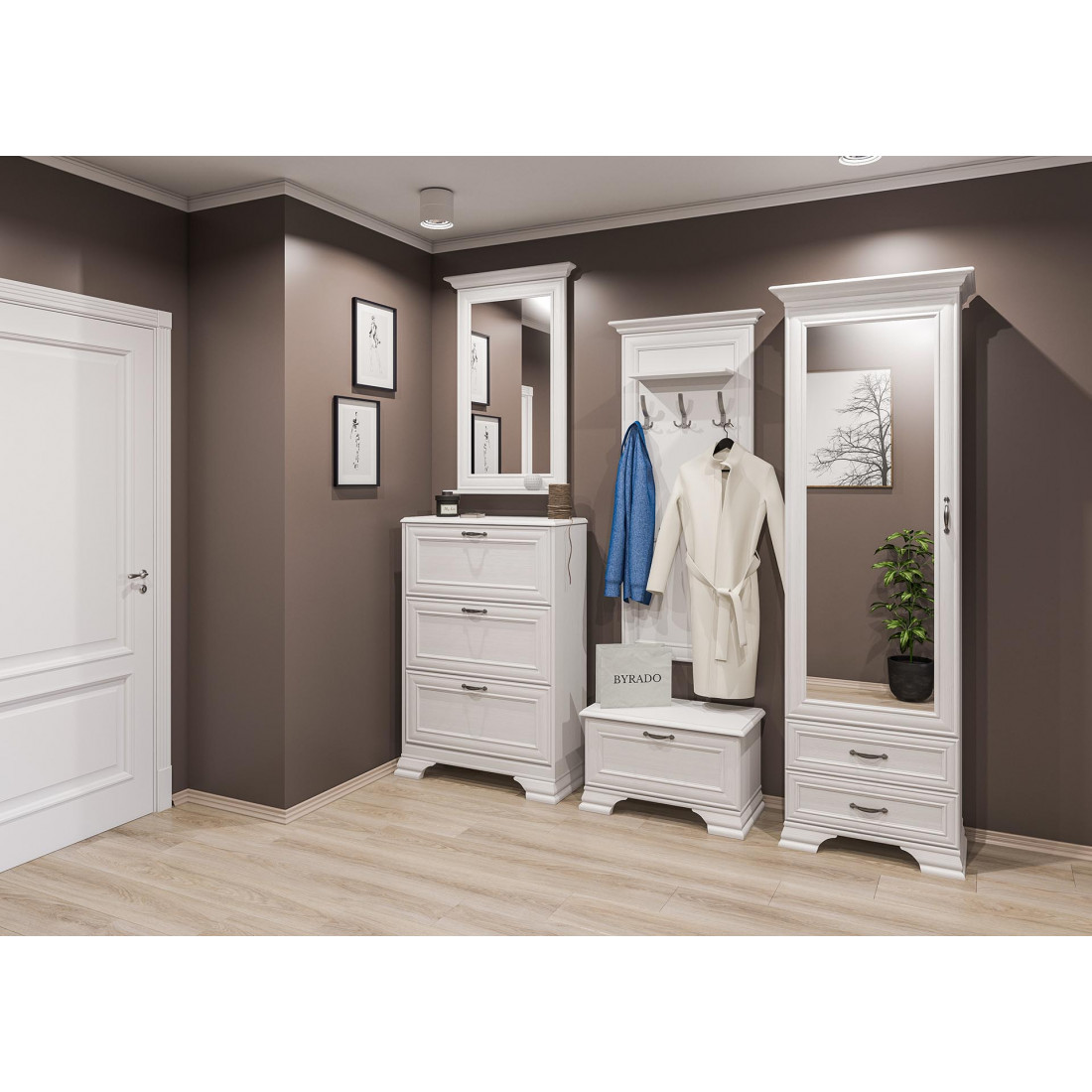 Мебель для прихожей Юнона от фабрики Мебель-Неман композиция 2 - новинка 2019 года в классическом стиле с отделкой структурной фактуры, обрамленная рамочным фасадом, где металлические ручки выгодно подчёркивают стиль и изящество, всегда актуален и востребован.