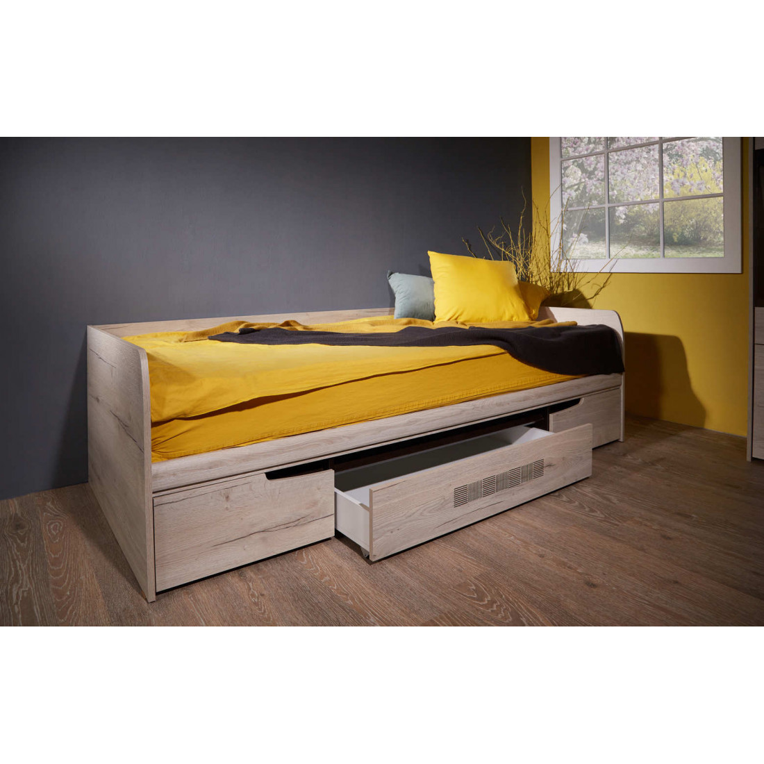 Кровать односпальная с ящиками Мале - обладательница лаконичного и свежего дизайна. Она является представителем коллекции «Мале». В этой коллекции особое внимание уделено внешнему виду и тактильным ощущениям от прикосновения к мебели, схожей с натуральным деревом по рисунку и шероховатости.