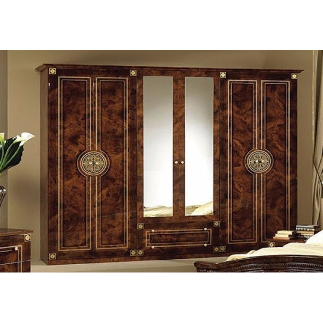Шестистворчатый шкаф Рома (орех) от Российской фабрики «ДИА мебель» выполнен в строгом, классическом стиле. Ореховый цвет в сочетании с глянцевым покрытием придает элегантность. Такой большой, вместительный шкаф не обходим в спальне, его большие и просторные полки с легкостью поместят весь ваш гардероб. Зеркало по центру шкафа визуально расширит комнату и придаст ей легкость. Вся коллекция "Рома" предназначена только для истинных ценителей элегантного классического стиля.