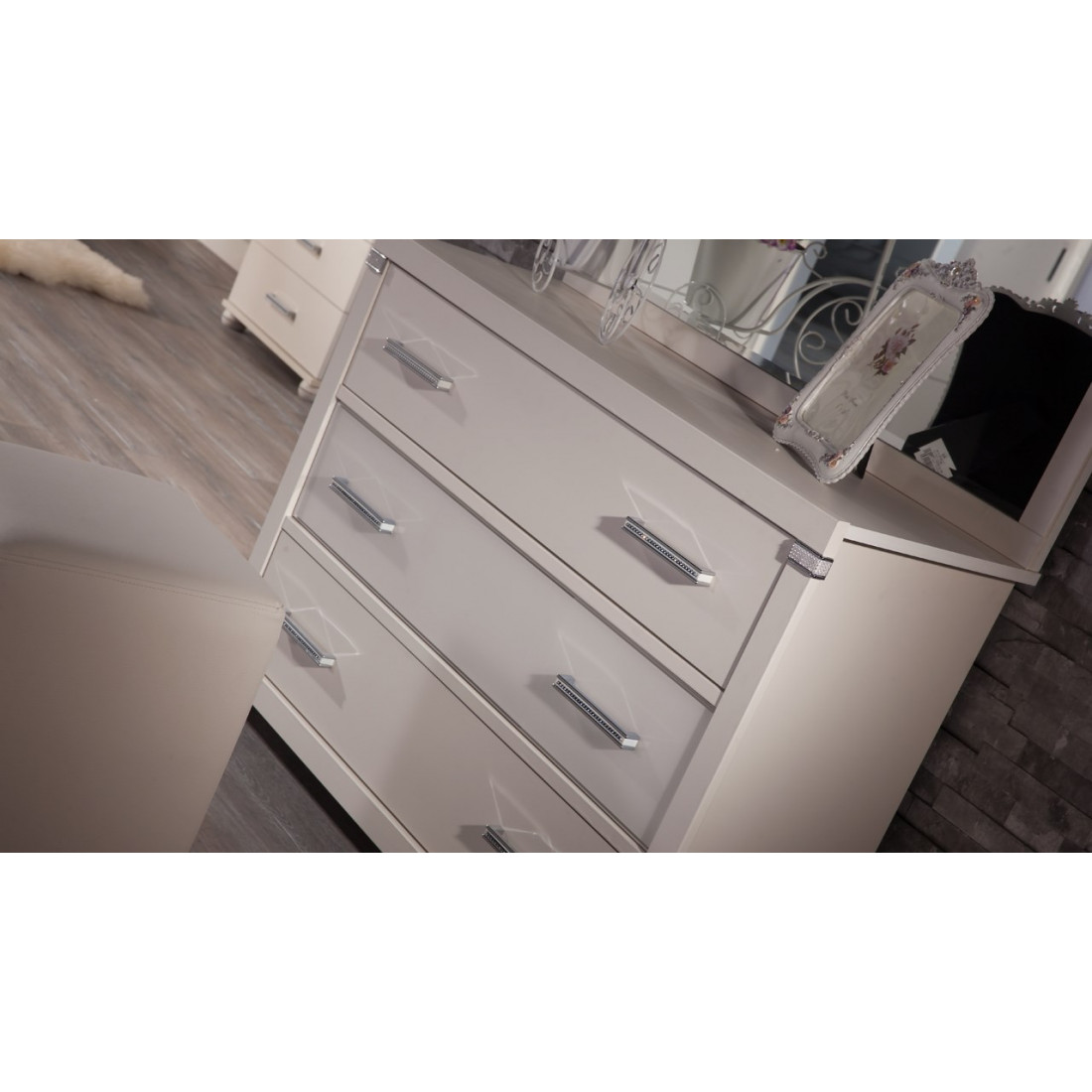 Широкий бельевой комод MIRA-23 (венге) серии мебели для спальни Мира от Белллона выполнен в благородном оттенке дуба венге с украшением из стразов и вставкой каленого черного стекла. Классическую конструкцию комоду из трех ящиков можно дополнить настенным зеркалом из серии соответствующего ширине крышке размера. Купить комплект комода и зеркала можно по отдельности, по сниженной цене.
