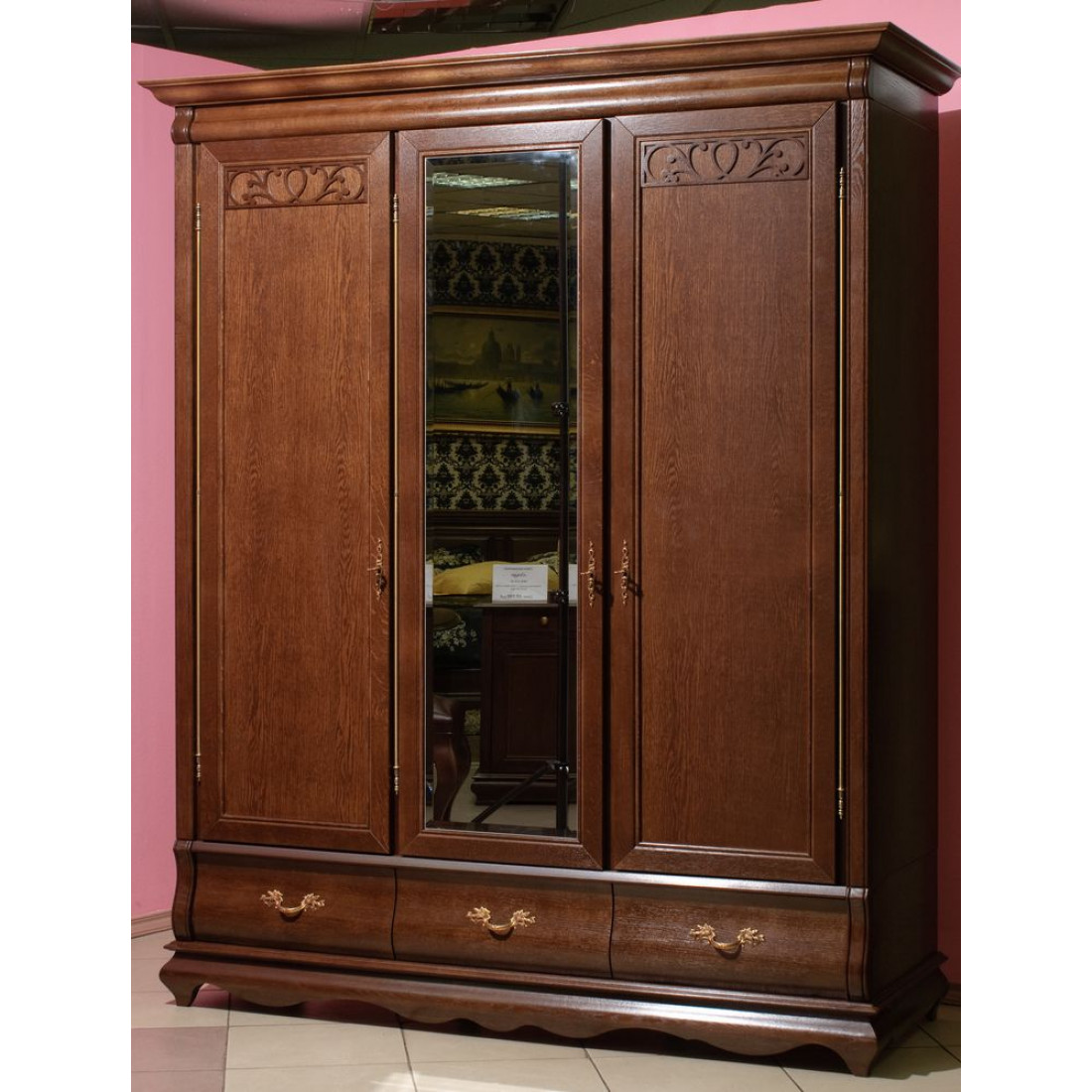 Классический трехдверный гардероб с зеркалом из коллекции мебели для спальни "Оскар" прекрасно впишется в интерьер спальни. Декорирован высокими карнизами, изящной резьбой и зеркальной поверхностью на центральной двери. Модель выполнена в цветовом решении "Орех".