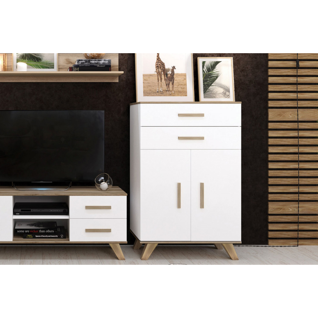 Комод 900 Вега Скандинавия (глянец, белый + дуб каньон)