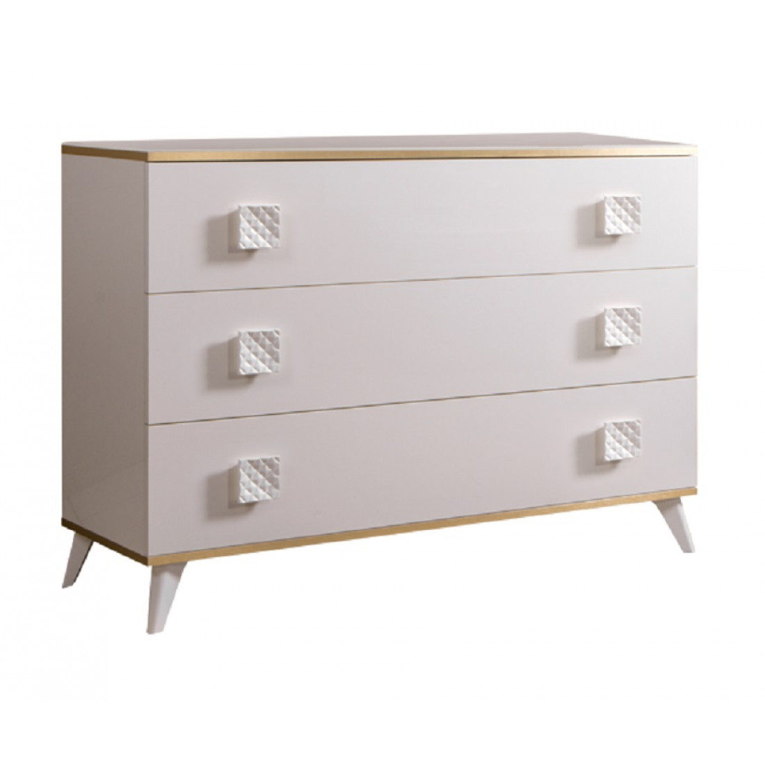 Великолепно вписались в концепцию спальни «Diora» поверхность комодов и тумбочек выполненная из стекла в соответствии с цветами корпуса. Это решение позволяет чаще делать влажную уборку и не боятся, что мебель испортится.