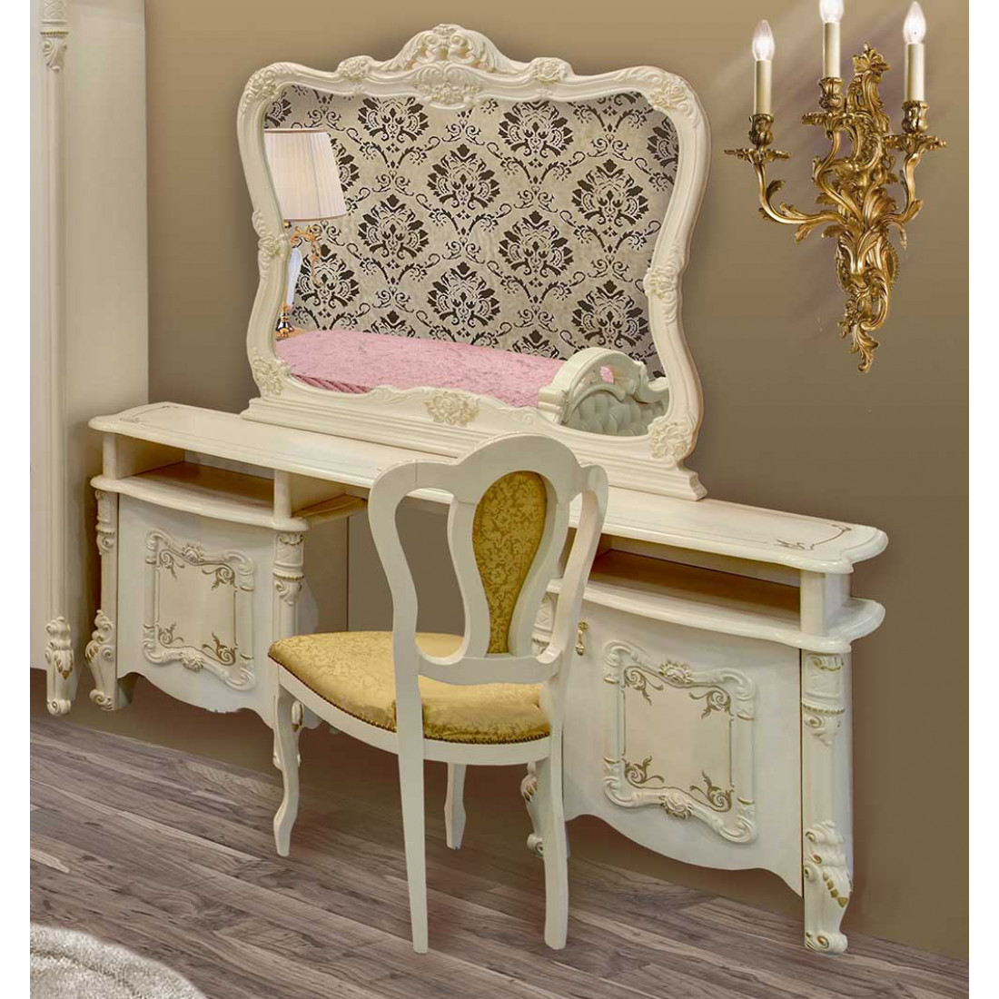 Туалетный столик с зеркалом Рафаэлла (беж) от Российской фабрики «ДИА мебель», выполнен в элегантно нежном бежевом цвете. Резная вставка и глянцевое покрытие придадут вашей спальне незабываемую атмосферу роскоши. Большое зеркало заключенное в объемную резную рамку придаст изумительное чувство стиля и сделает вашу комнату легче и светлее. Коллекция «Рафаэлла» предназначена для людей умеющих по достоинству оценить комфорт.