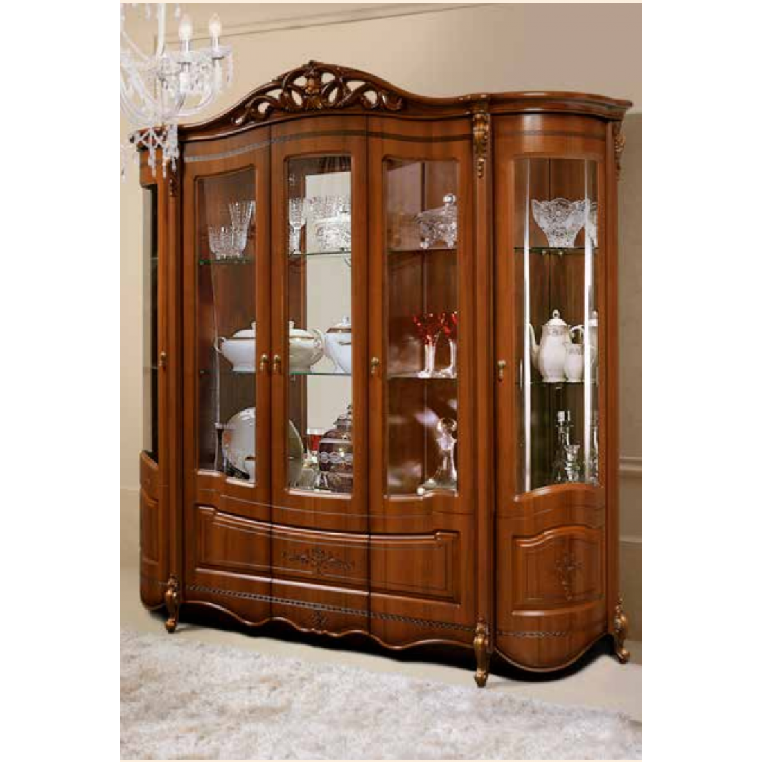 Шкаф-витрина пятидверная Аллегро 8 (орех) – данная модель сделает вашу гостиную неповторимой и нарядной. Ее стеклянные дверцы и зеркальный корпус придадут комнате светлую атмосферу, а стеклянные полки для посуды сделают эту витрину легкой и воздушной даже не смотря на ее мощный с первого взгляда фасад. Резные вставки в сочетании с тонкой росписью подчеркнет классический стиль и послужит показателем богатства и престижа хозяев дома.